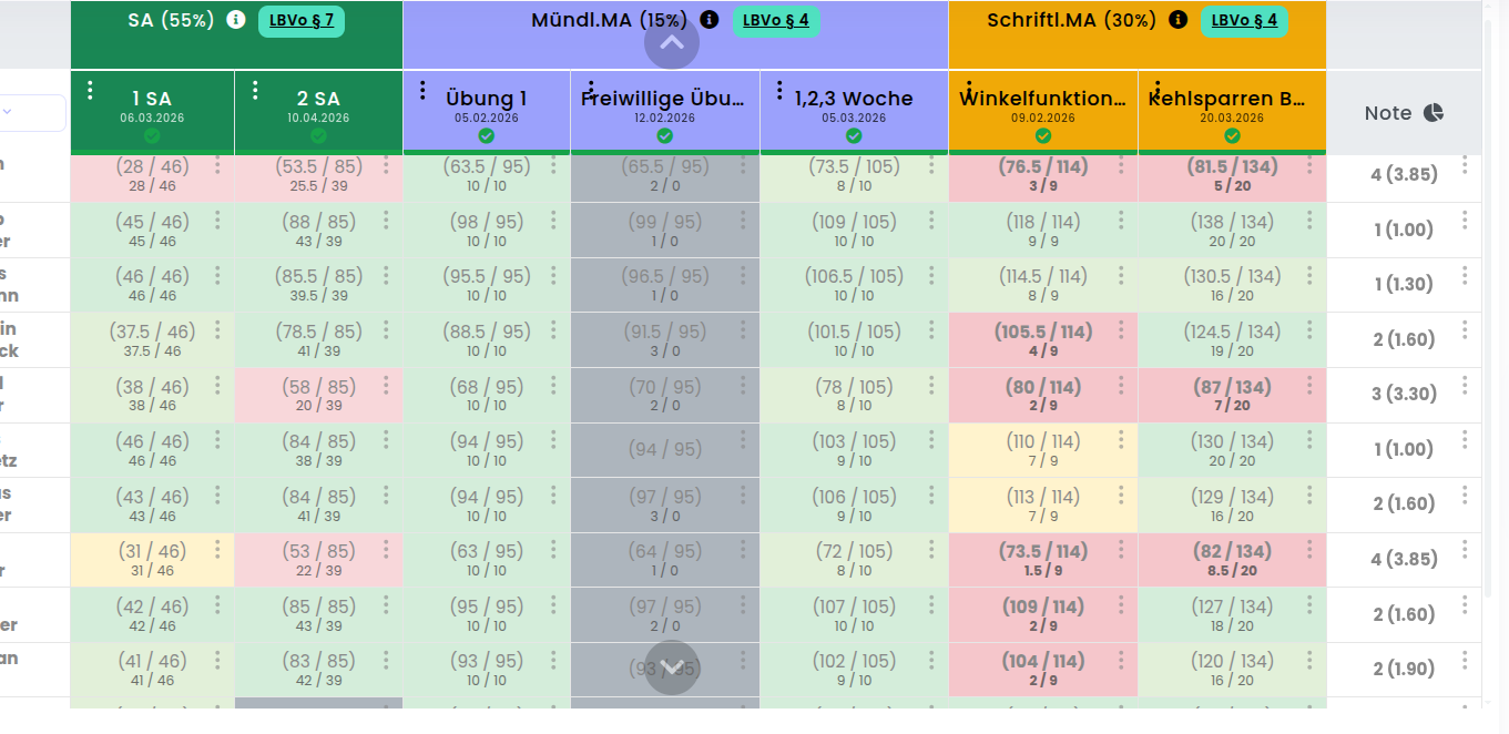 Weit mehr als eine Excel-Tabelle. Profitieren Sie von intelligenten Zusatzfunktionen wie automatischer Notenberechnung, Verlaufshistorie und direkter Schülerzuordnung.